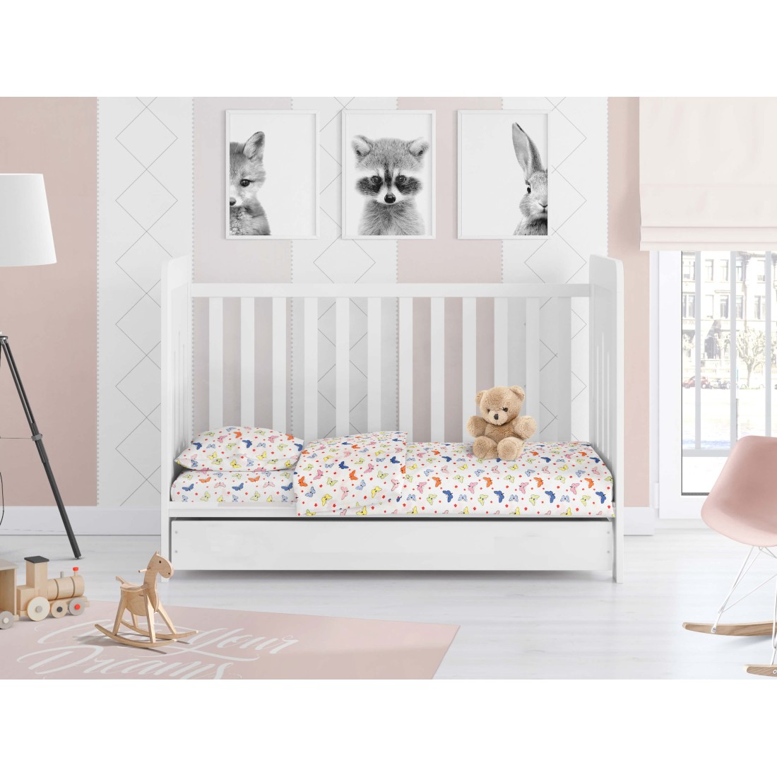 Σετ Σεντόνια Κούνιας 3 Τεμαχίων Dimcol Butterfly 49 Rotary Print, που περιλαμβάνει πανωσέντονο, κατωσέντονο και μαξιλαροθήκη, διακοσμημένα με όμορφα παιδικά σχέδια σε χαρούμενα χρώματα.