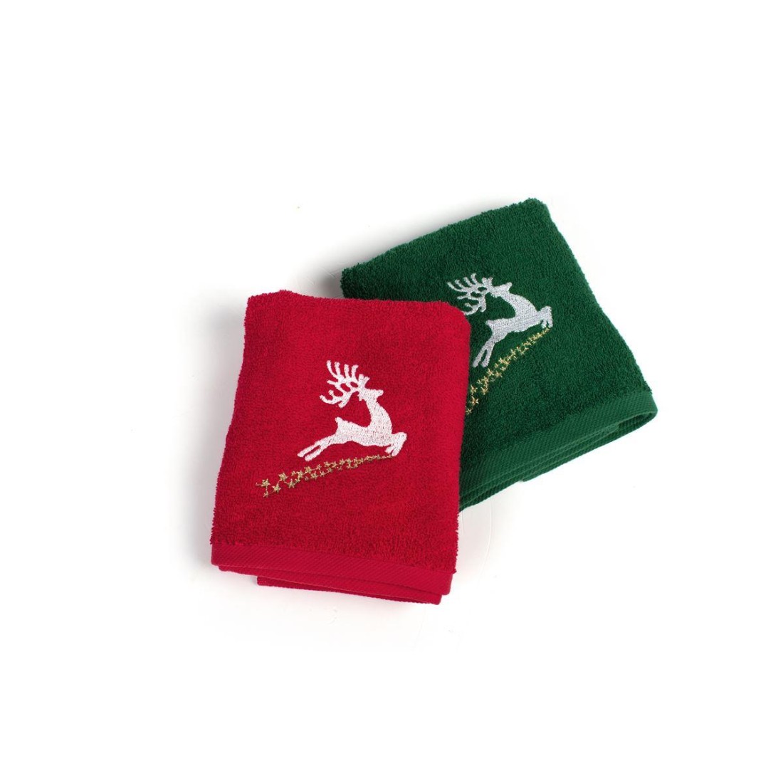 Σετ πετσέτες Χριστουγεννιάτικες 2 τεμ. με κεντημένα χαρούμενα γιορτινά σχέδια και ανεξίτηλα χρώματα. ιδανικό για δώρο που περιέχει που περιέχει: 2 πετσέτες χειρός διαστάσεων 40X60. μία σε κόκκινο και μία σε πράσινο χρώμα. Οι πετσέτες είναι κατασκευασμένες από 100% βαμβάκι έξτρα απαλό και απορροφητικό. Συσκευασία δώρου με γιορτινή κορδέλα.