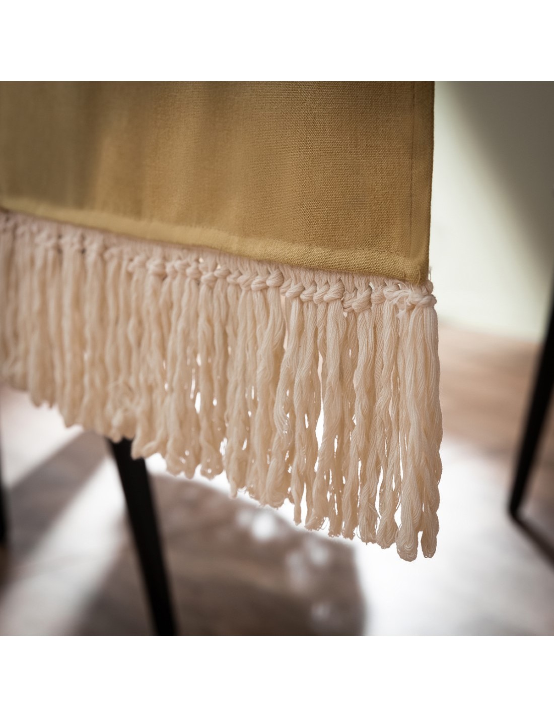 Από ανθεκτικό μονόχρωμο ύφασμα με χνούδι στην επιφάνεια και εκρού μακρύ κρόσσι στο τελείωμα.