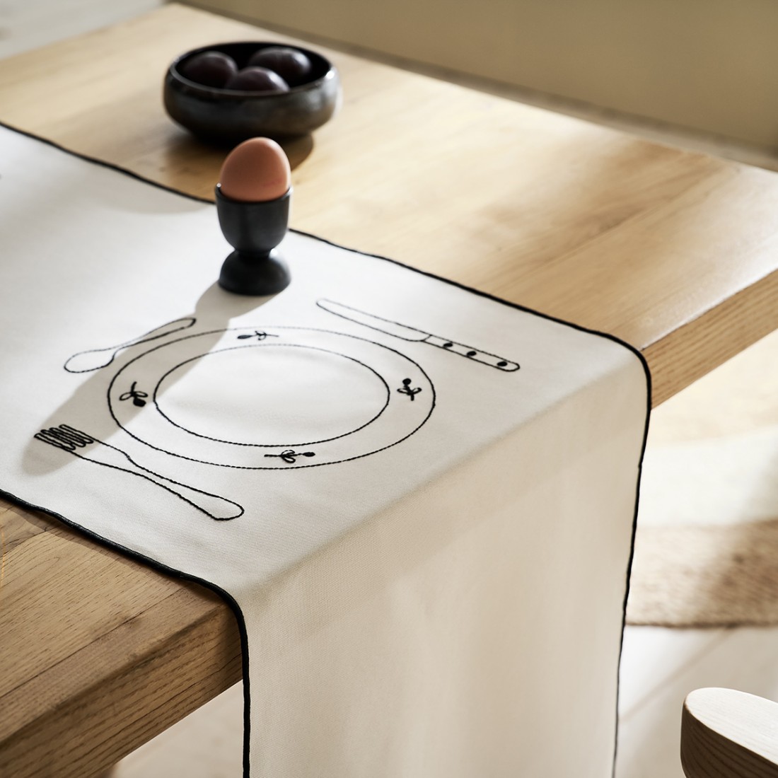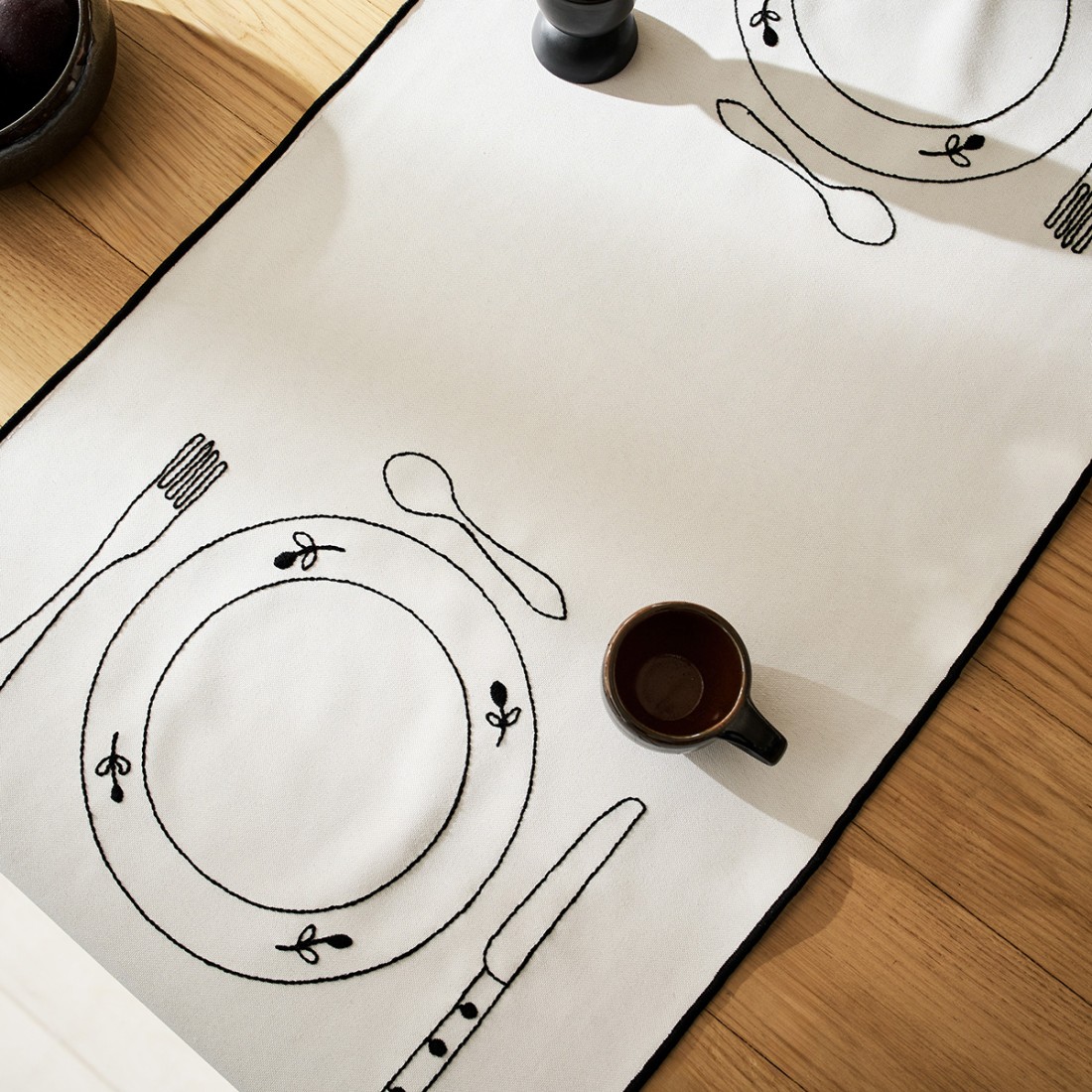 Αλέκιαστο runner με επεξεργασία ''teflon'' και ανάφλυφα κεντημένα σχέδια line art. . Το ύφασμα διατηρεί την μαλακή και φυσική του υφή ενώ ταυτόχρονα γίνεται αδιάβροχο και μπορεί να προστατευτεί από τους λεκέδες.