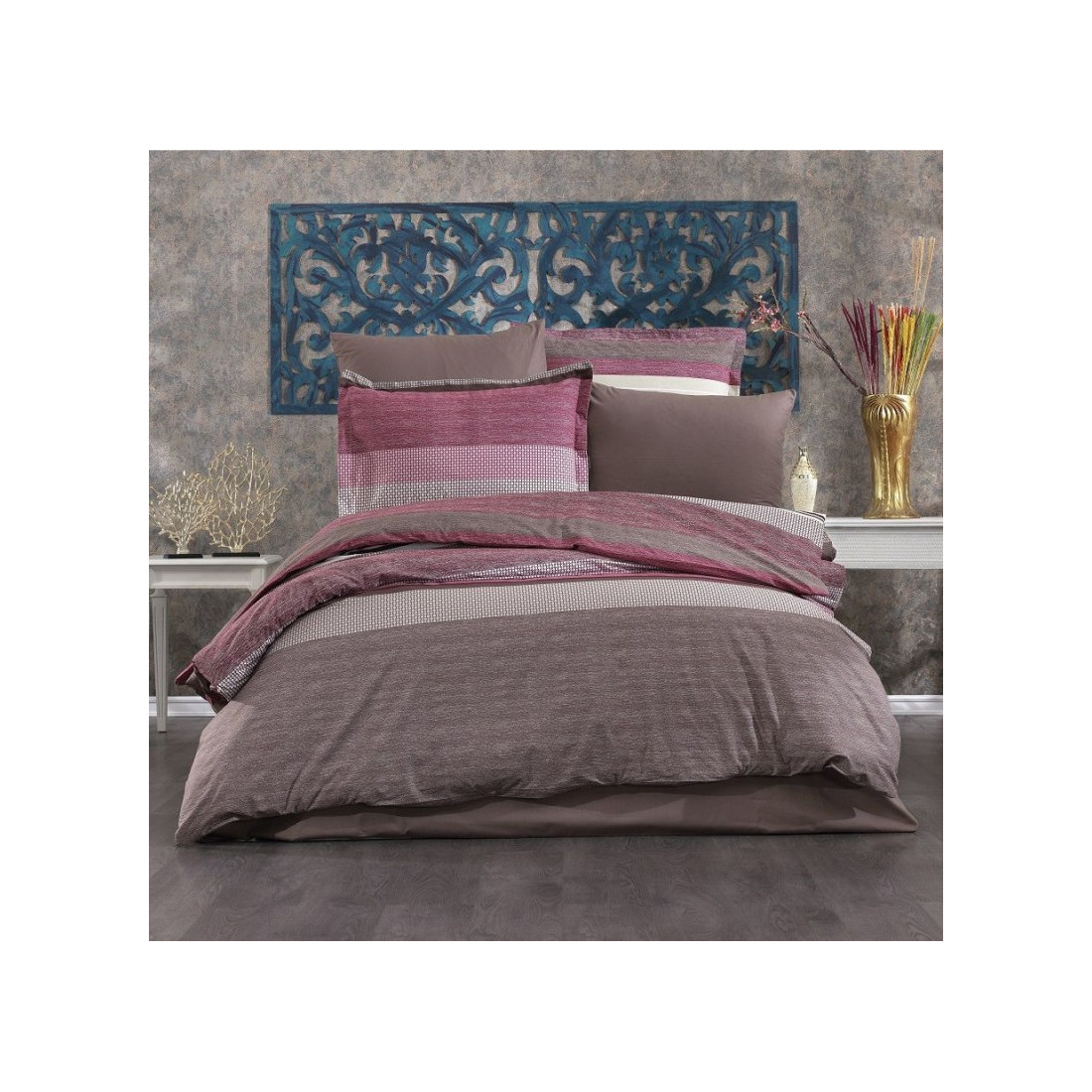 ΠΑΠΛΩΜΑ ΥΠΕΡΔΙΠΛΟ 220X240 - NADINE -Μοντέρνο σχέδιο σε συνδυασμό με τα χρώματα που επιτάσσει η μόδα. Ιδιαίτερο ριγέ μοτίβο σε σομόν και μώβ αποχρώσεις που πρόκειται να δώσει μοναδική αισθητική στο υπνοδωμάτιό σας. Με την πιο ευχάριστη αίσθηση πολυτέλειας “100% COTTON 152 TC ” ιδιαίτερης ύφανσης που προσδίδει ιδιαίτερη απαλότητα στο ύφασμα. Ενώ το μοναδικό φινίρισμα τους φαίνεται από την αντοχή στις πλύσεις και την ευκολία στο σιδέρωμα τους. Θα τα βρείτε και σε σετ σεντόνια και παπλωματοθήκες .