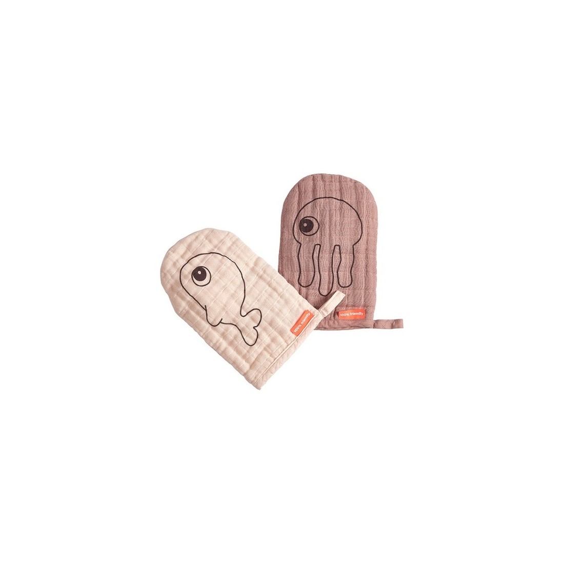 Ένα σετ δύο μαλακών γαντιών πλυσίματος μουσελίνης σε ταιριαστά χρώματα διακοσμημένα με φίλους της θάλασσας