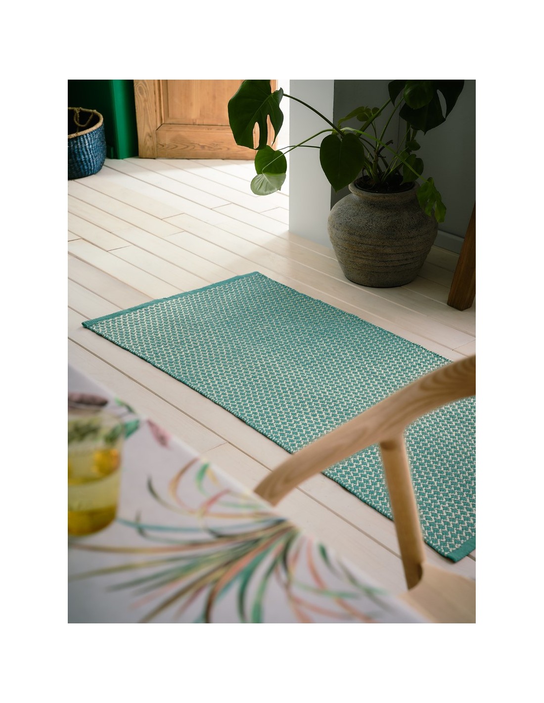 Υφαντό χαλί από βαμβακερά νήματα και κροσσάκι στις δύο πλευρές.