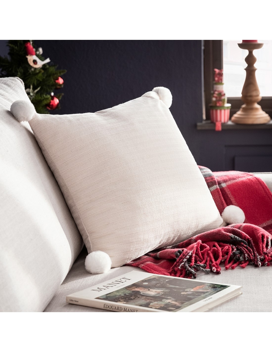 Μονόχρωμο υφαντό ύφασμα με μεγάλα pom pom στις γωνίες.