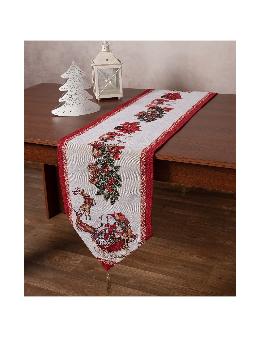 Χριστουγεννιάτικη τραβέρσα στόφα με διακοσμητικές φούντες