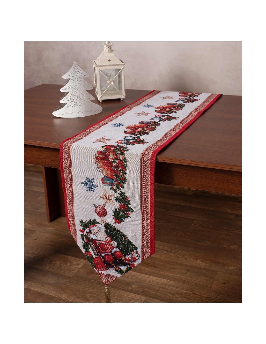 Χριστουγεννιάτικη τραβέρσα στόφα με διακοσμητικές φούντες
