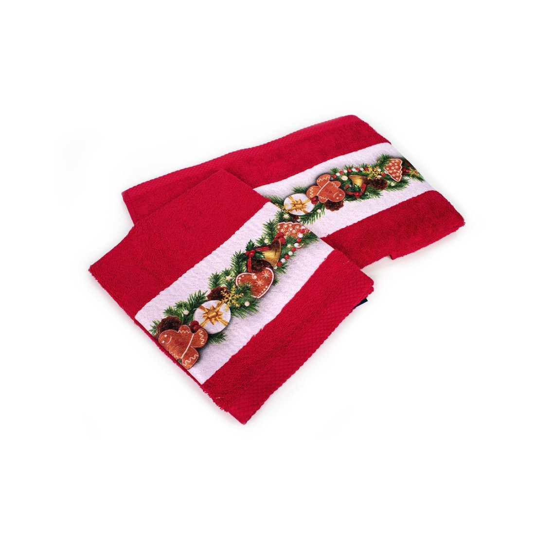 Σετ πετσέτες Χριστουγεννιάτικες 2 τεμ. σε χρώμα κόκκινο. με ανεξίτηλα χρώματα και σχέδιο με φάσα ψηφιακής εκτύπωσης που απεικονίζει γιορτινά στολίδια. ιδανικό για δώρο που περιέχει: 1 τεμ. πετσέτα χειρός. διαστάσεων 30X50 και 1 τεμ. πετσέτα προσώπου. διαστάσεων 50X90. Οι πετσέτες είναι κατασκευασμένες από 100% βαμβάκι έξτρα απαλό και απορροφητικό και είναι ελεγμένες για επιβλαβείς ουσίες με το αναγνωρισμένο παγκοσμίως πιστοποιητικό. OEKO TEX® Standard 100. Συσκευασία δώρου με γιορτινή κορδέλα.