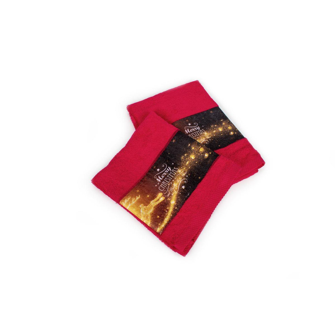 Σετ πετσέτες Χριστουγεννιάτικες 2 τεμ. σε χρώμα κόκκινο. με ανεξίτηλα χρώματα και σχέδιο με φάσα ψηφιακής εκτύπωσης που απεικονίζει γιορτινούς τάρανδους και μήνυμα για καλά Χριστούγεννα. ιδανικό για δώρο που περιέχει: 1 τεμ. πετσέτα χειρός. διαστάσεων 30X50 και 1 τεμ. πετσέτα προσώπου. διαστάσεων 50X90. Οι πετσέτες είναι κατασκευασμένες από 100% βαμβάκι έξτρα απαλό και απορροφητικό και είναι ελεγμένες για επιβλαβείς ουσίες με το αναγνωρισμένο παγκοσμίως πιστοποιητικό. OEKO TEX® Standard 100. Συσκευασία δώρου με γιορτινή κορδέλα.