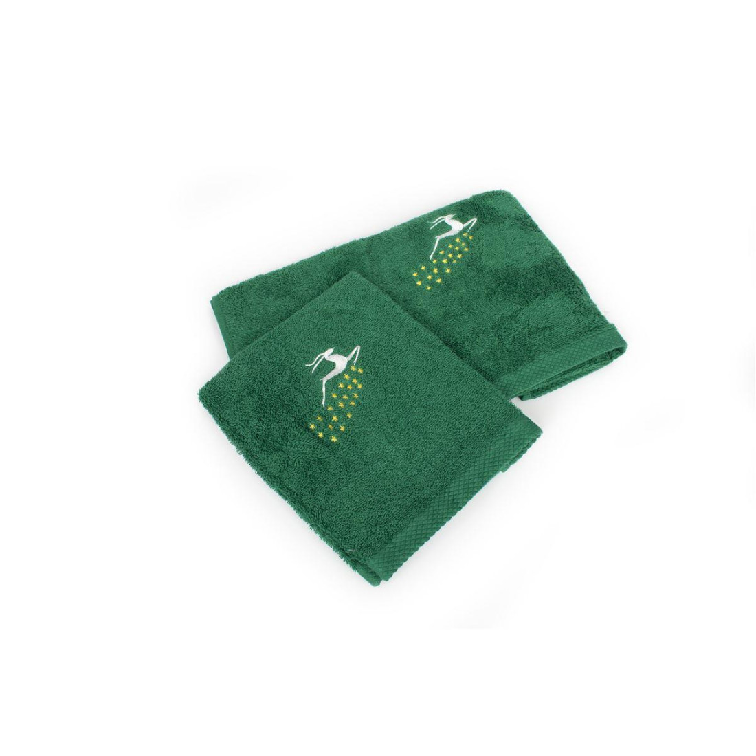 Σετ πετσέτες Χριστουγεννιάτικες 2 τεμ. σε χρώμα πράσινο. με ανεξίτηλα χρώματα και κεντημένο σχέδιο που απεικονίζει γιορτινό τάρανδο που πετάει στα αστέρια. ιδανικό για δώρο που περιέχει: 1 τεμ. πετσέτα χειρός. διαστάσεων 30X50 και 1 τεμ. πετσέτα προσώπου. διαστάσεων 50X90. Οι πετσέτες είναι κατασκευασμένες από 100% βαμβάκι έξτρα απαλό και απορροφητικό και είναι ελεγμένες για επιβλαβείς ουσίες με το αναγνωρισμένο παγκοσμίως πιστοποιητικό. OEKO TEX® Standard 100. Συσκευασία δώρου με γιορτινή κορδέλα.