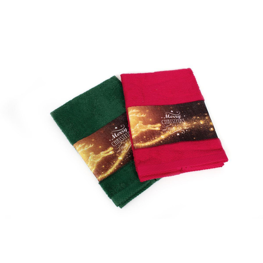 Σετ πετσέτες Χριστουγεννιάτικες 2 τεμ. με ανεξίτηλα χρώματα και σχέδιο με φάσα ψηφιακής εκτύπωσης που απεικονίζει γιορτινούς τάρανδους και μήνυμα για καλά Χριστούγεννα. ιδανικό για δώρο που περιέχει που περιέχει: 2 πετσέτες χειρός. διαστάσεων 40X60. μία σε κόκκινο και μία σε πράσινο χρώμα. Οι πετσέτες είναι κατασκευασμένες από 100% βαμβάκι έξτρα απαλό και απορροφητικό και είναι ελεγμένες για επιβλαβείς ουσίες με το αναγνωρισμένο παγκοσμίως πιστοποιητικό. OEKO TEX® Standard 100. Συσκευασία δώρου με γιορτινή κορδέλα.