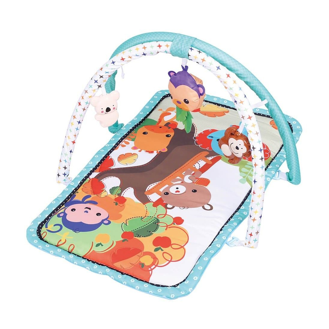- Το γυμναστήριο περιλαμβάνει μαλακό, παχύ και πολύχρωμο στρώμα, ώστε να μπορεί το μωρό να παίζει εύκολα και άνετα. Από τις μπάρες του γυμναστηρίου κρέμονται 4 πολύχρωμα παιχνίδια. Ευρωπαϊκές προδιαγραφές ΕΝ71 και CΕ certification από 100 ασφαλή υλικά