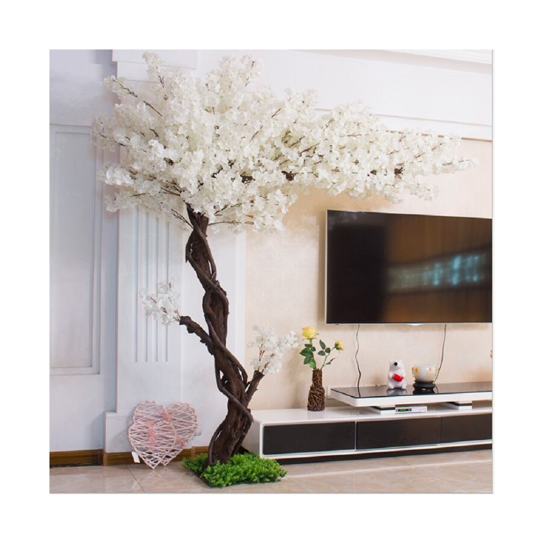 Το Cherry Blossom White είναι ένα εξαιρετικά δημοφιλές και επιβλητικό δέντρο εσωτερικού χώρου. Έχει λείο και ψηλό κορμό που περιπλέκεται από ένα αναρριχώμενο κλαδί, όρθια μεγάλα κλαδιά και ελλειψοειδή φύλλα, ενώ τα άνθη της είναι μεγάλα και λευκά. Διαθέτει μεταλλική βάση και μπορεί να βιδωθεί στο πάτωμα ώστε να είναι πιο σταθερό. Θεωρείται ιδανική επιλογή διακόσμησης για βιτρίνες καταστημάτων λόγω της γωνίας 90ο που δημιουργείται από τον κορμό και το φύλλωμά του. Μπορεί να χρησιμοποιηθεί και σε επαγγελματικούς χώρους όπως καφέ, μπαρ, ξενοδοχεία, αλλά και για χρήση σε εποχιακές διακοσμήσεις όπως γάμοι, βαφτίσεις κλπ.