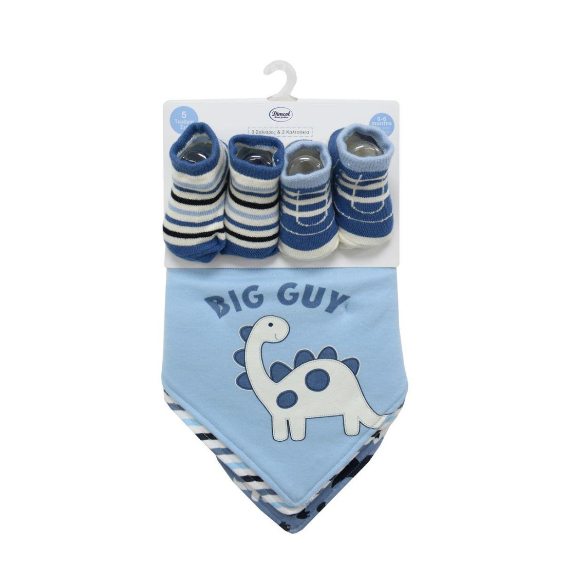 Σετ σαλιάρες μπαντάνα 5 τεμαχίων δύο στρώσεων σε διάφορα σχέδια και χρώματα. με κουμπάκια σε δύο διαφορετικά σημεία για πιο εύκολη εφαρμογή γύρω από το λαιμό του μωρού σας. Το σετ περιέχει : 3 σαλιάρες μπαντάνα και 2 ζευγάρια καλτσάκια διαστάσεων 9X5.5 cm. Οι σαλιάρες είναι κατασκευασμένες από CVC interlock ύφασμα 60% Βαμβάκι 40% Polyester στην πάνω στρώση και επένδυση από Terry ύφασμα 180 gr/m² της ίδιας σύνθεσης στην κάτω και τα καλτσάκια από 55% βαμβάκι 43% polyester 2% spandex. Το CVC ύφασμα καθιστά την σαλιάρα πολύ μαλακή. ανθεκτική προς την σμίκρυνση και τα χρώματά της ανεξίτηλα. Οι σαλιάρες και τα καλτσάκια είναι ελεγμένα για επιβλαβείς ουσίες με το αναγνωρισμένο παγκοσμίως πιστοποιητικό. OEKO TEX® Standard 100.