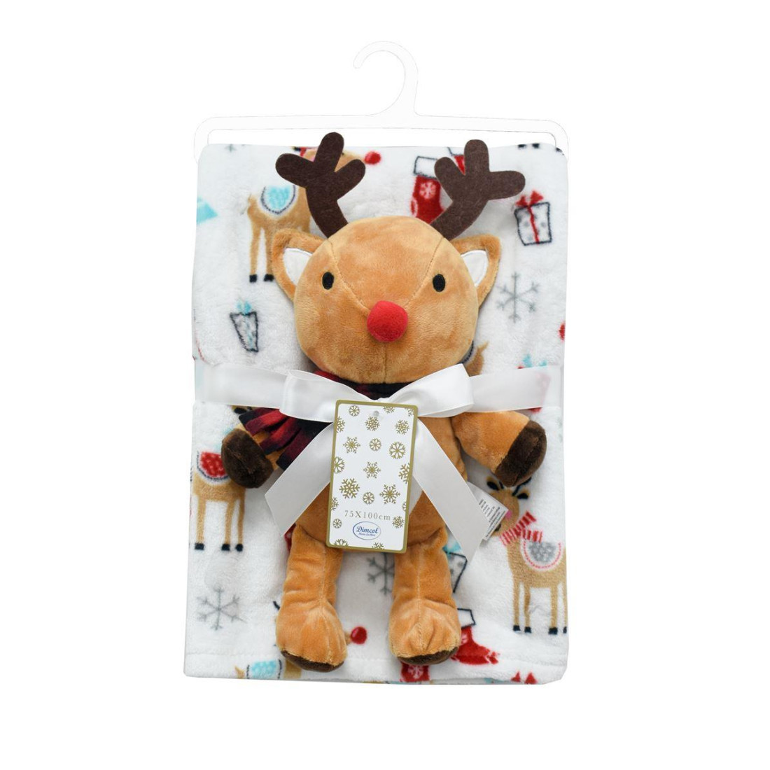 Χριστουγεννιάτικο λούτρινο Ταρανδάκι Rudolph με την χαρακτηριστική κόκκινη μύτη. ύψους 30 cm. σετ 2 τεμαχίων μαζί με κουβερτούλα coral fleece με εμπριμέ σχέδιο που απεικονίζει γιορτινούς ταράνδους. δέντρακια. δώρα και κάλτσες. διαστάσεων 75X100 cm. Κατασκευασμένο από 100% polyester. κάτι το οποίο το καθιστά πολύ απαλό και βελούδινο στο άγγιγμα. Το λούτρινο και η κουβερτούλα είναι ελεγμένα για επιβλαβείς ουσίες με το αναγνωρισμένο παγκοσμίως πιστοποιητικό. OEKO TEX® Standard 100 και έχουν κατασκευαστεί σύμφωνα με τα ευρωπαϊκά πρότυπα υγείας. ασφάλειας και προστασίας του περιβάλλοντος σύμφωνα με την πιστοποίηση CE.